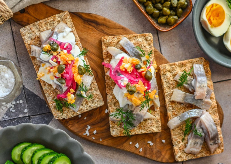 Tükelda heeringafilee parajateks tükkideks ja aseta näkileivale või röstitud mustale leivale. Tõsta peale supilusikatäis kreemjat juustukastet. Kaunista marineeritud punase sibula, hakitud muna, kapparite ja tillioksaga. Viimistle värskelt jahvatatud musta pipraga.