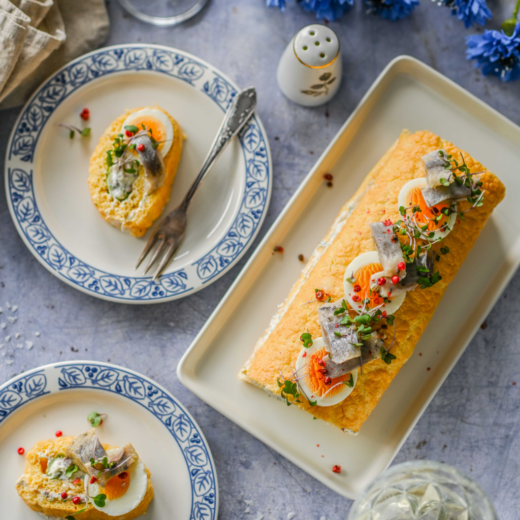 Keera biskviit küpsetuspaberi abil rulli. Kaunista keedetud muna viilude, heeringatükkide ja hakitud värske tilli või murulauguga.