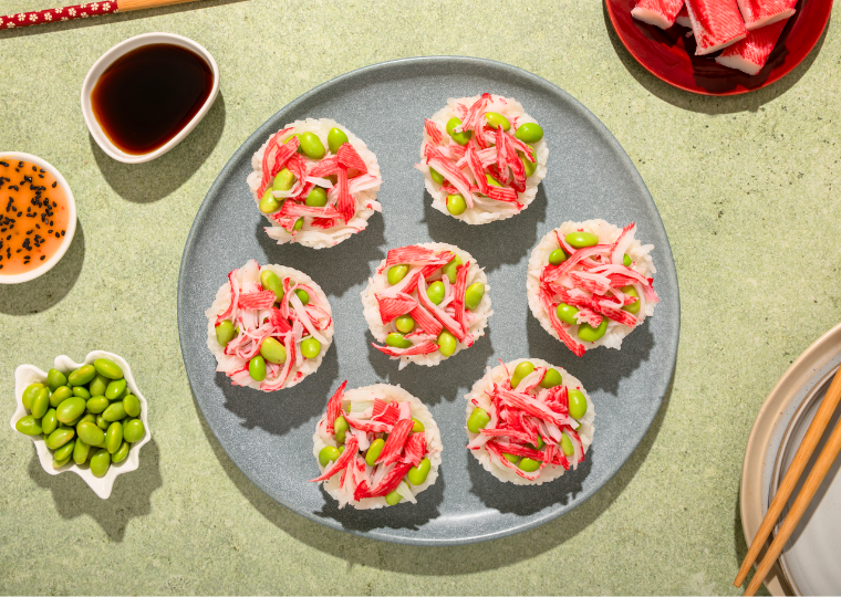 Kui korvikesed on tahenenud, võta need vormidest välja ja täida need tükeldatud surimi ja edamame ubade seguga.