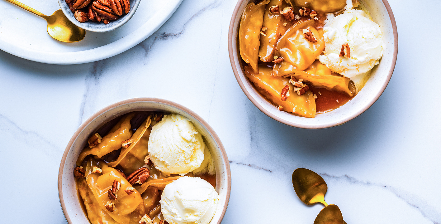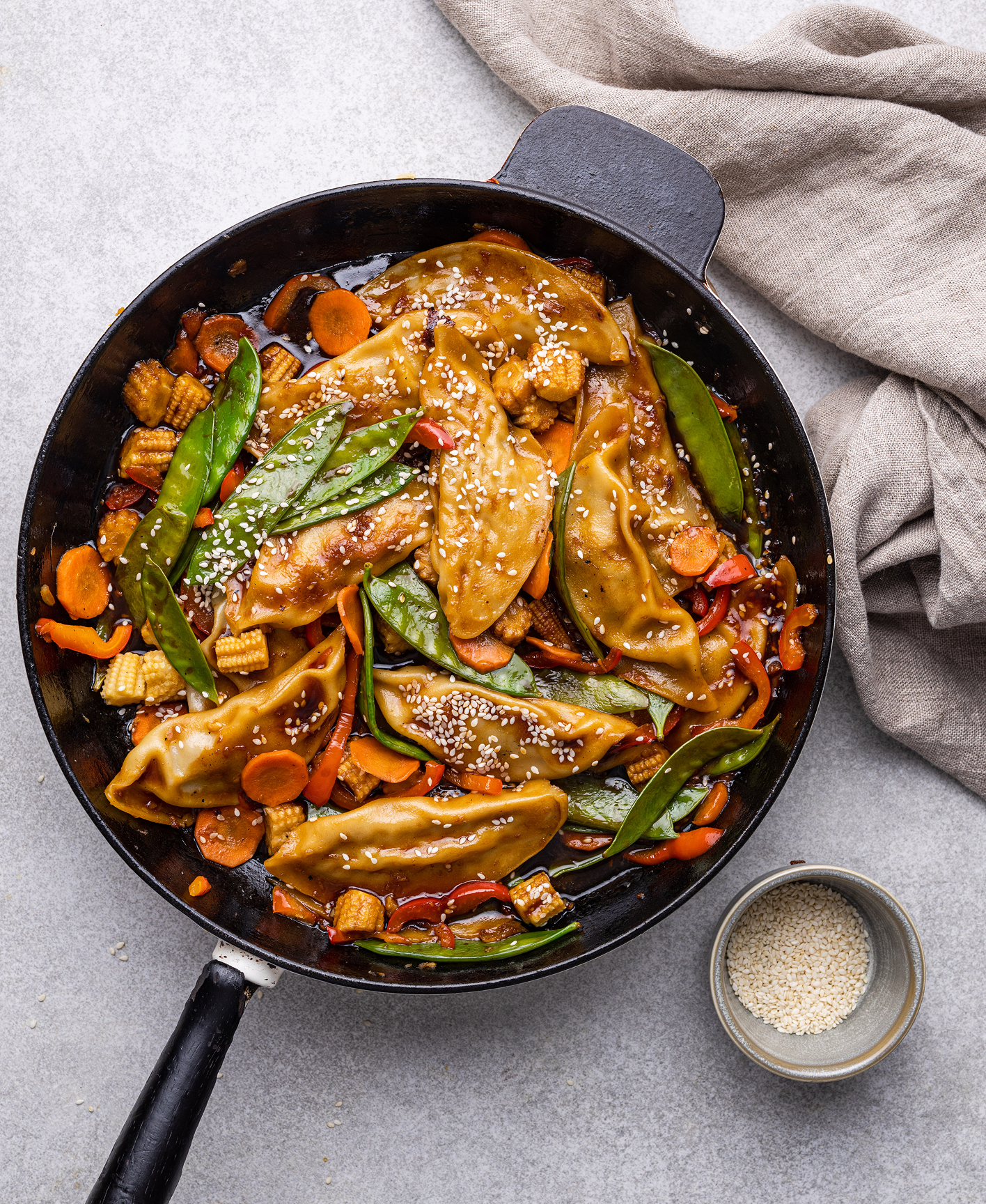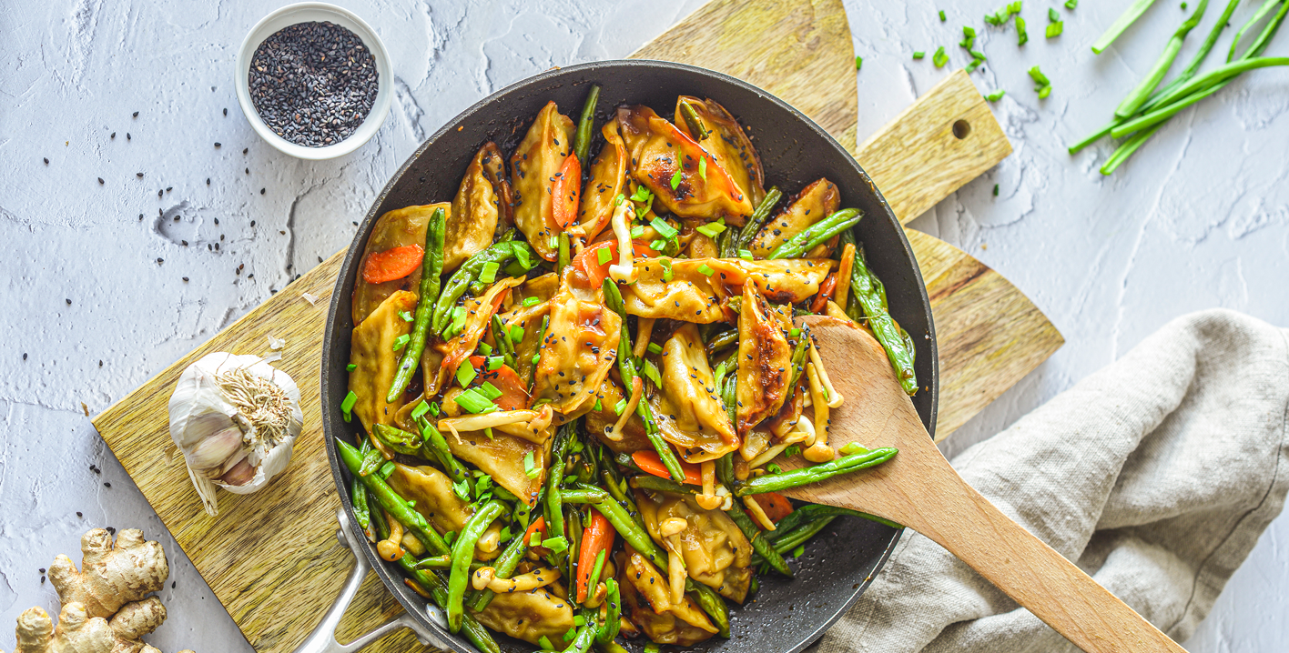 Į keptuvę prie GYOZA grąžiname apkeptas daržoves, supilame padažą ir išmaišome. Patiekiant pabarstome sezamo sėklomis.