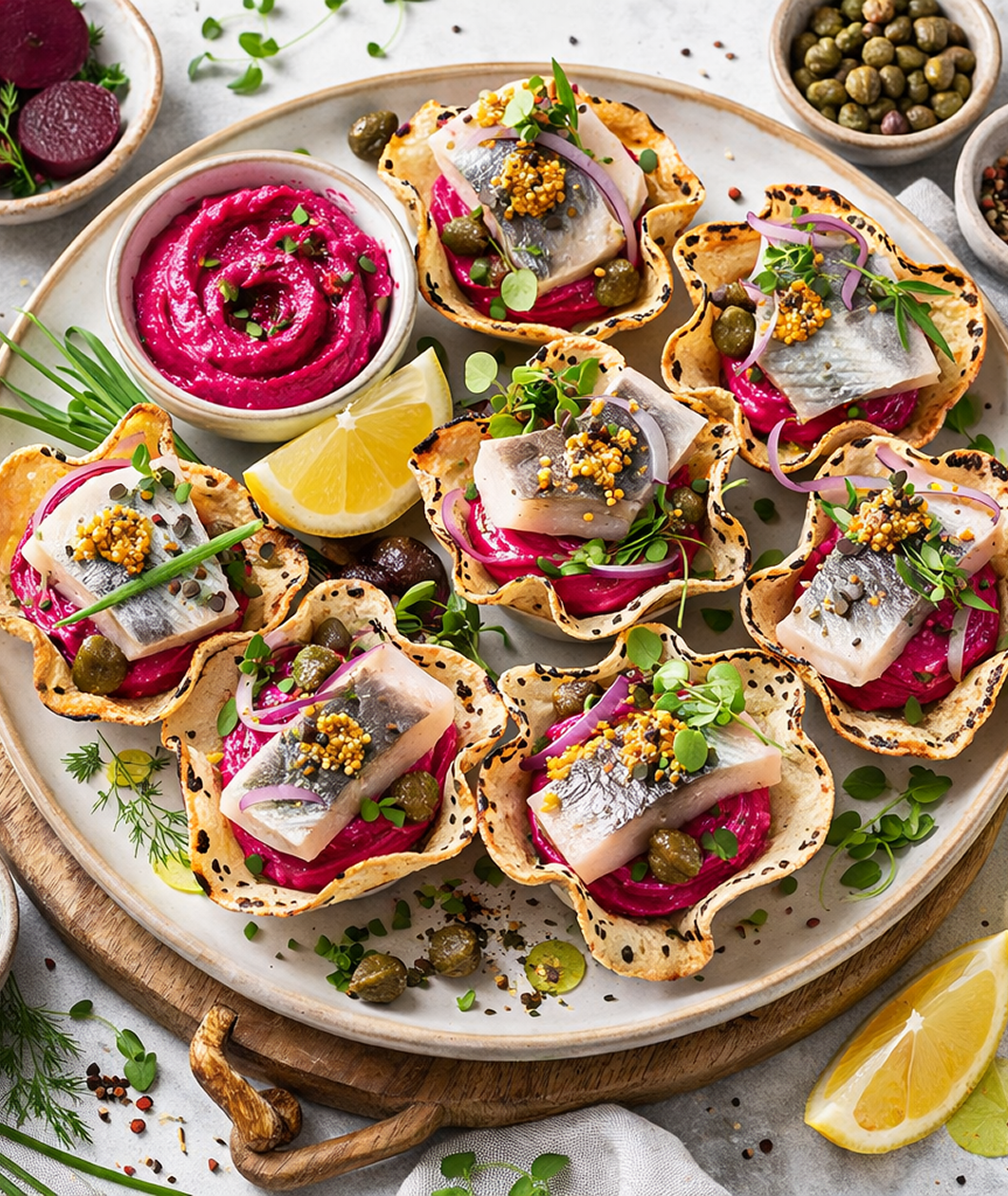 Suformuokite krepšelius. Į atvėsusias tortilijų formeles dėkite burokėlių kremą, ant viršaus uždėkite silkės gabalėlių. Pagardinkite trupučiu Dižono garstyčių ir kaparėlių. Papuoškite laiškiniais česnakais ar kitais mėgstamais žalumynais.